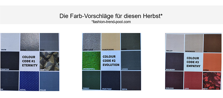 Erdtöne, kühle Blau-Nuancen und warme Rottöne. Gewürz-Nuancen: Salbei, Safran, Curry. pudrige Rosés, Burgund-Nuancen.